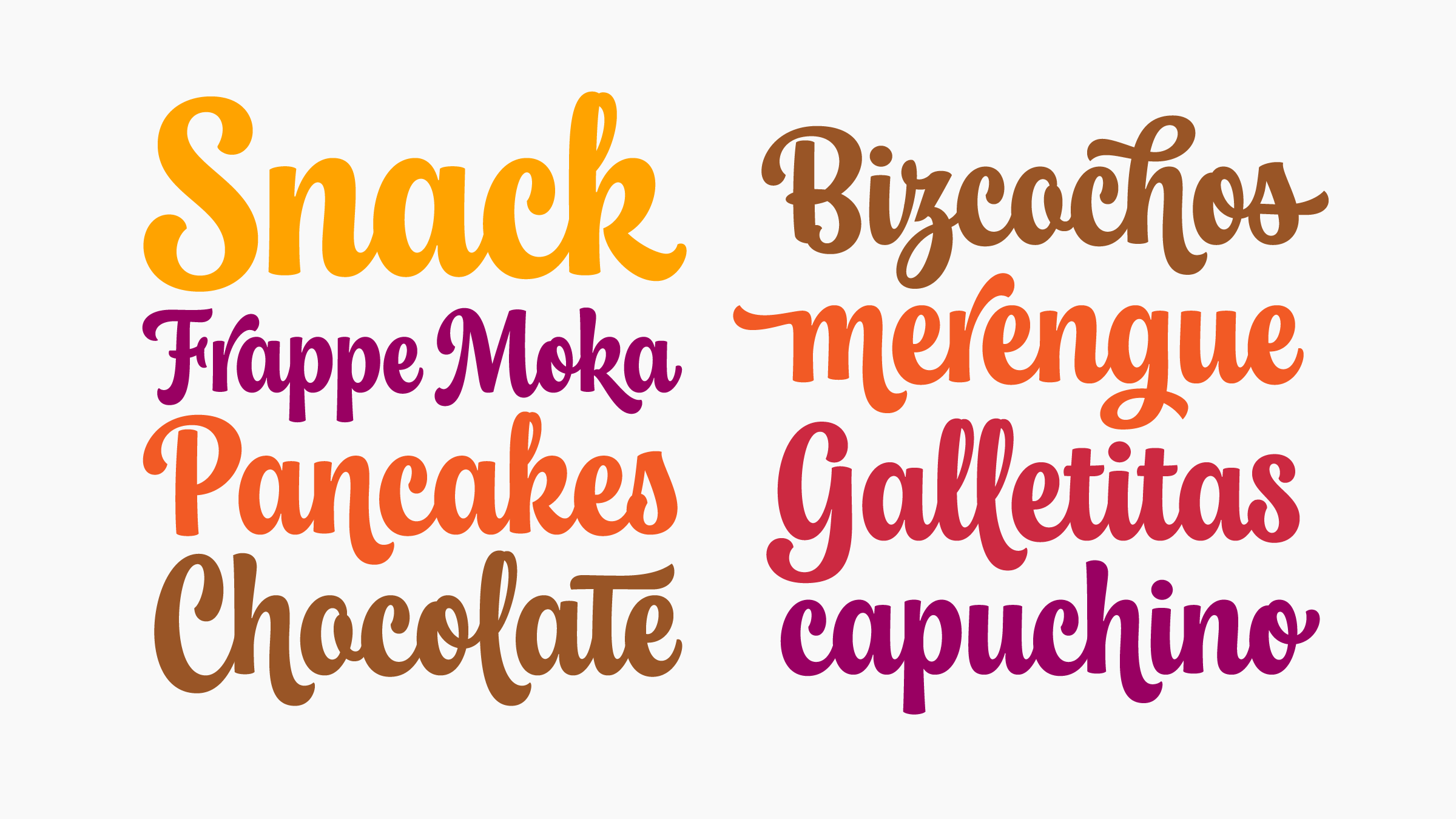 In the Regular font, the ascenders, descenders and capitals are the shorter they could be; while in Poster, they are larger, in order to achieve more graceful forms. Both options include stylistic sets and ligatures to embellish the words. Use professional software that widely support Open Type features. Otherwise, you may not have access to some glyphs. Keep the Standard Ligatures and Contextual Alternates features always active. For further information about features and alternates, see the User Guide