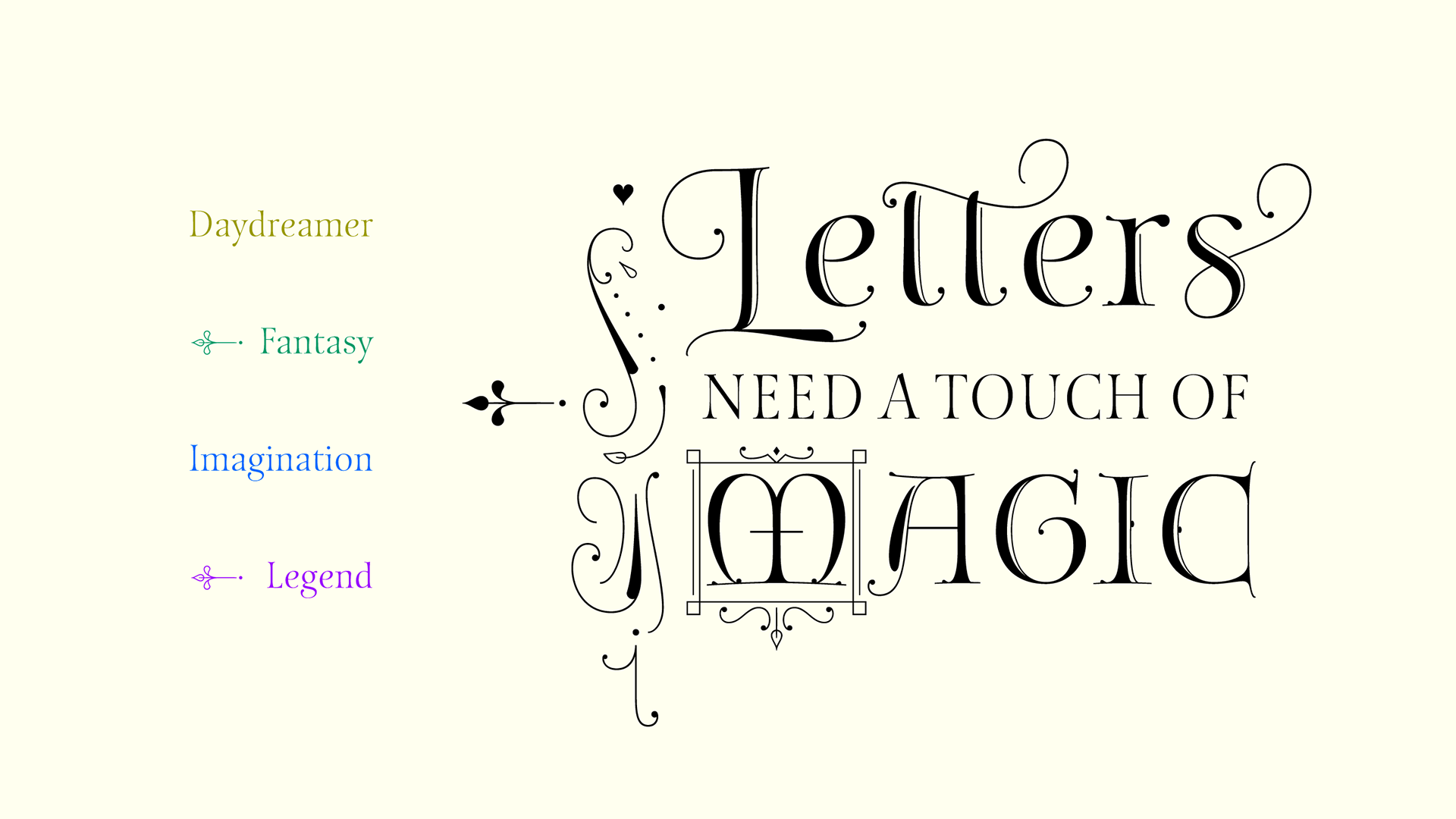 Fantasy draws on a series of historical calligraphic traditions: Roman capitals, Lombardic initials, enlightenment era ornamentation and refinement. The user is invited to deploy their imagination playing with the alternates, ornaments and frames in different universes like publications and stationery.