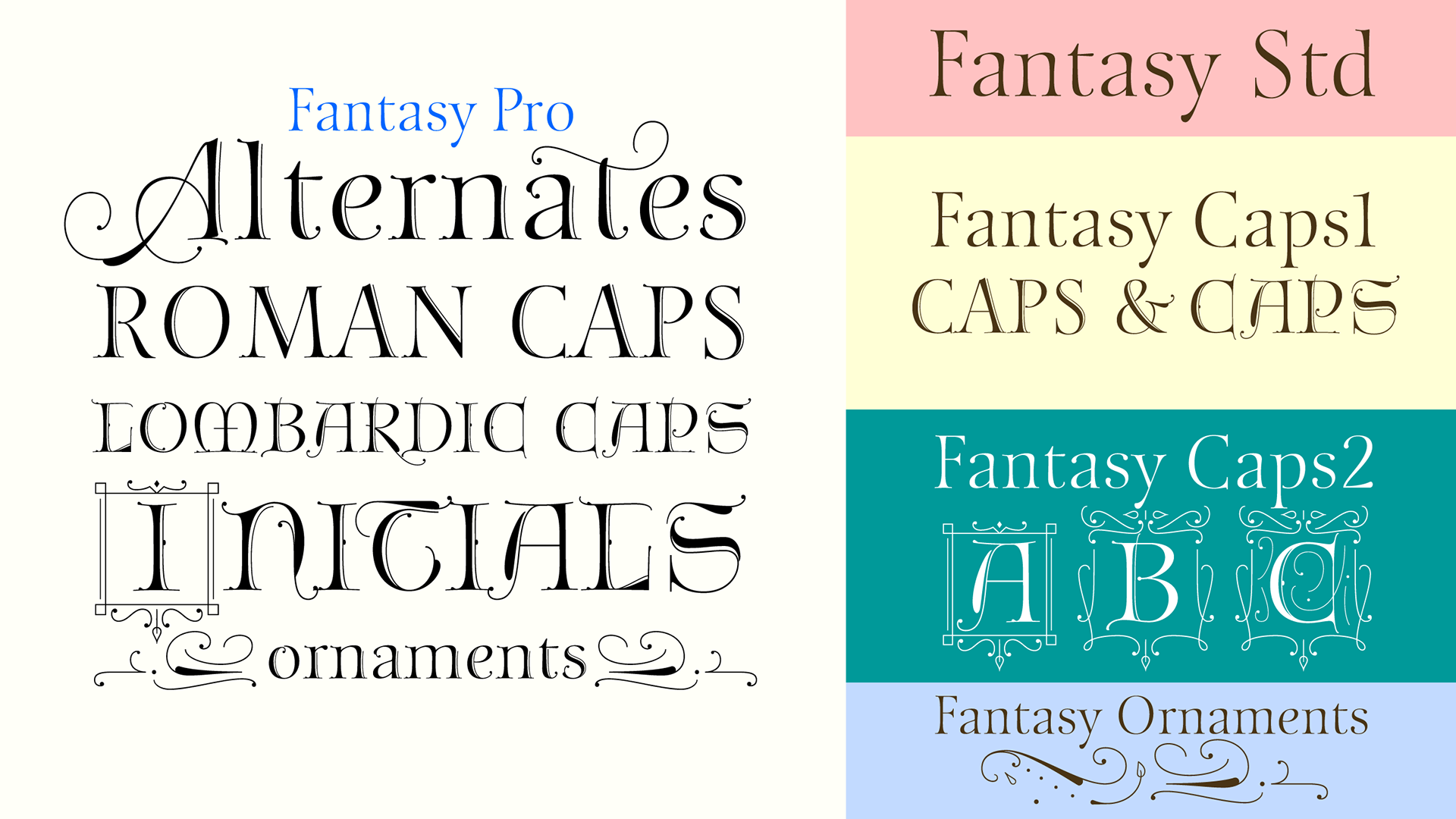 Fantasy Pro is the fully-featured OpenType version with two styles of capitals and plenty of swash alternates and ornaments. Each of these varieties is available as a separate font in addition to Fantasy Std, a set of unadorned standard characters for smaller settings.