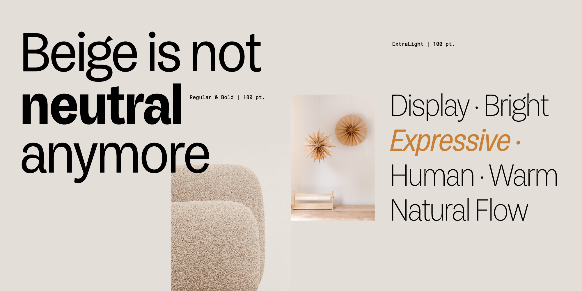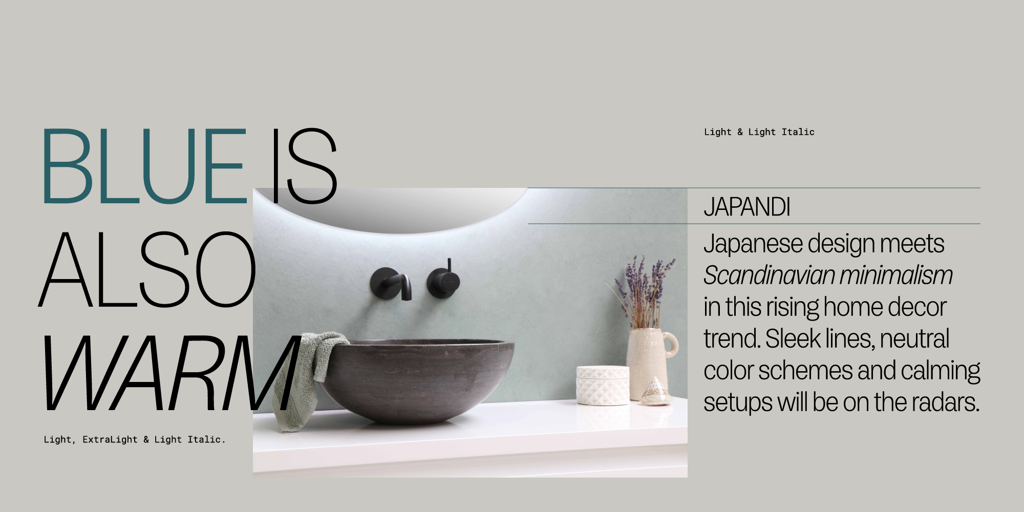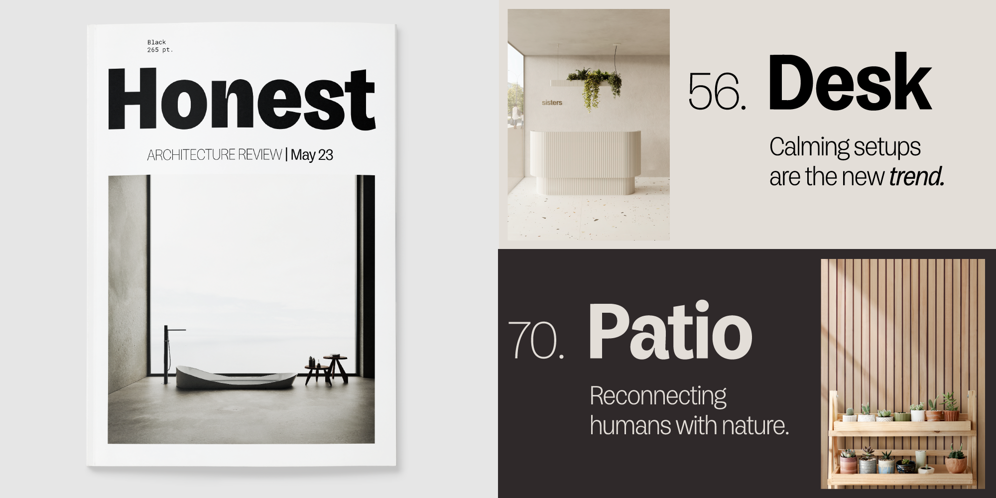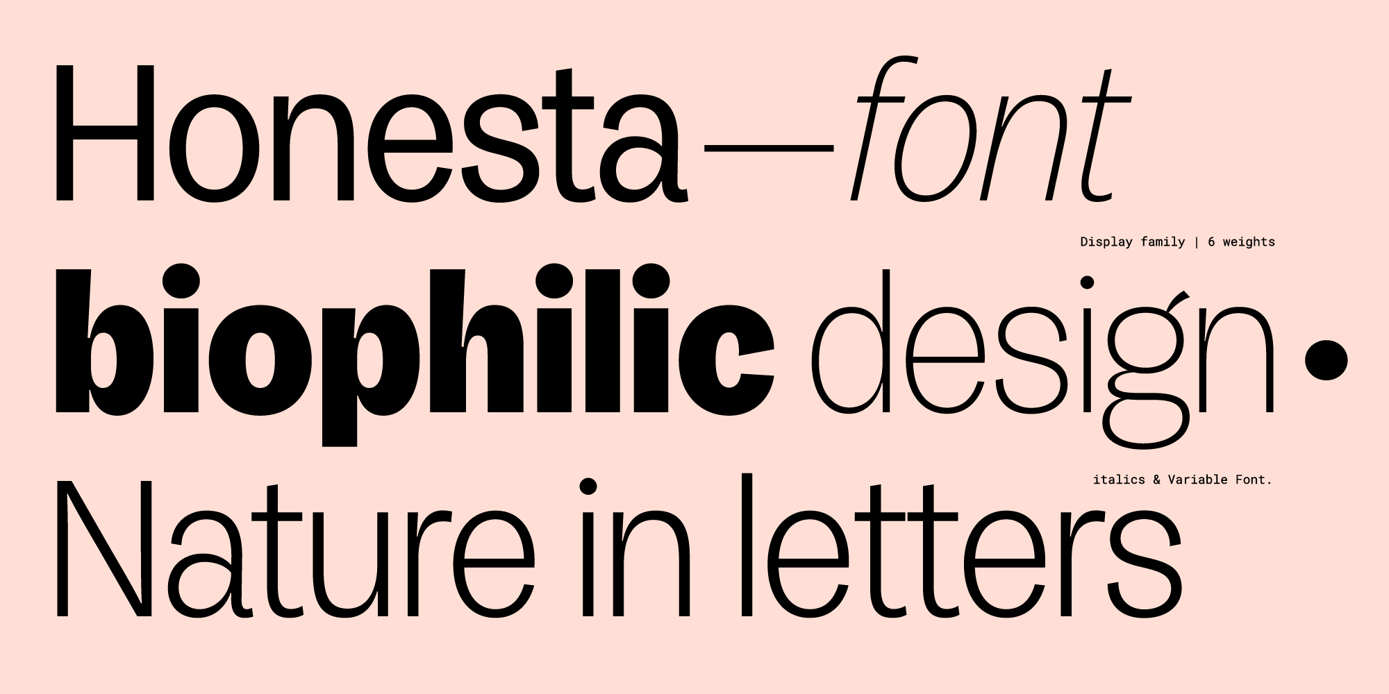 Honesta — Spanish for honest — is a display grotesque typeface infused with an engaging human touch. The nuances found in the exaggerated contrast from stem to curve and the slightly angular terminals give what could be seen as ordinary a stylish appeal. It balances natural expression and digital clarity perfectly, offering a refreshed, modern sans for typographic designers wanting a little bit of the unexpected. Honesta is a 12-style family, including true italics and variable fonts.