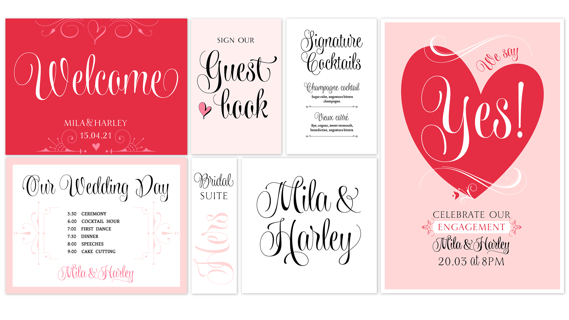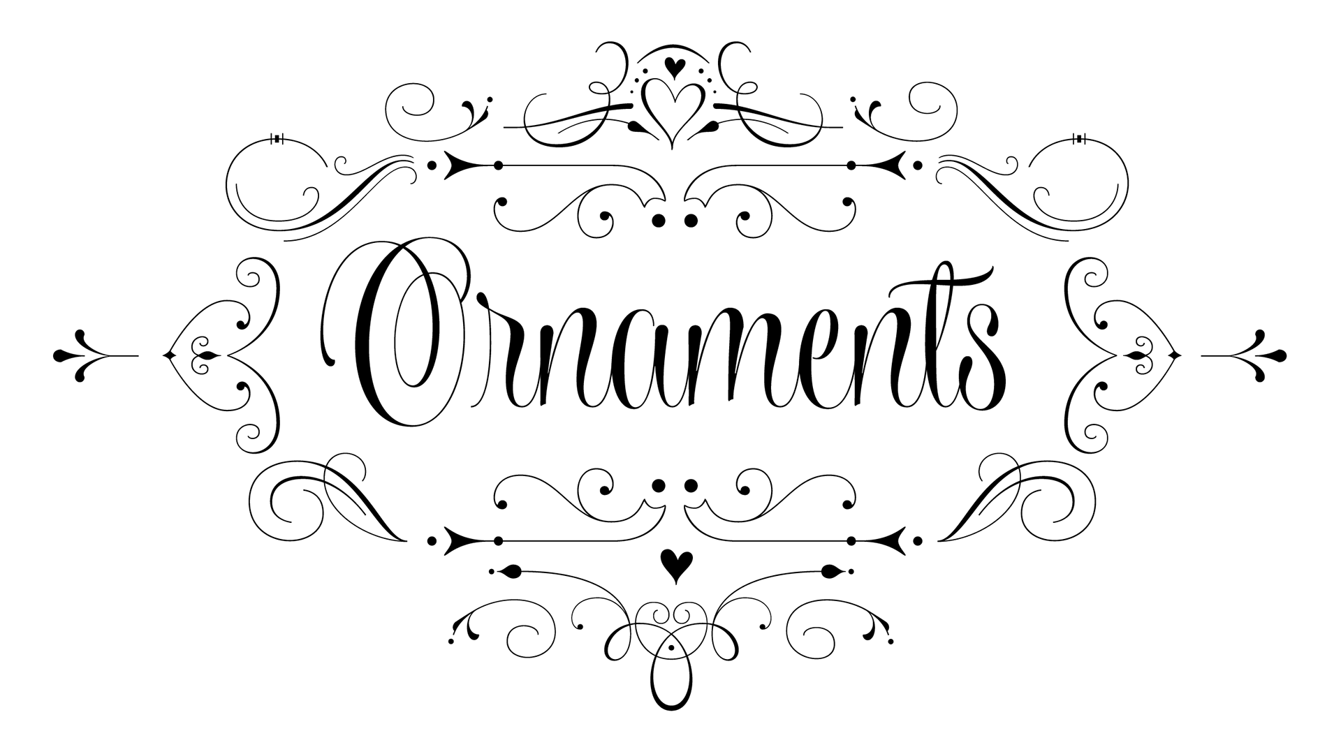 Plenty of swashes, ligatures, beginning and ending shapes, Wishes is a wit option for invitations, cards, stationery, fashion and apparel, among a wide range of uses. The curves of the cursive style are neither too solemn or pompous, its grace and playfulness are more 1950s than 1750s. This family offers the designer an additional decorative toolkit full of frames, ribbons, hearts, flowers and ornaments, plus a collection of caps and small caps.